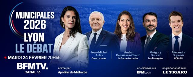 | Ne ratez pas le grand débat ! | | | Débat animé par Apolline de Malherbe sur BFMTV et co-diffusé sur BFM Lyon et Le Figaro TV. Elle sera accompagnée de Élodie Poyade (BFM Lyon) et d’Yves Thréard (Le Figaro). Les quatre principaux candidats à la mairie de Lyon seront réunis pour confronter leurs visions et leurs propositions pour la ville : • Jean-Michel Aulas, (Cœur Lyonnais) • Grégory Doucet, maire sortant (Les Écologistes) • Anaïs Belouassa-Cherifi, députée (La France Insoumise) • Alexandre Dupalais, (Union des droites pour la République – Rassemblement national) Rendez-vous mardi 24 février à 20h55 | | | | Les enquêtes de la rédaction | | | Santé : actualités, vidéos et conseils | | | Téléchargez l’application BFM | | | | Vous recevez cet e-mail car vous êtes inscrit(e) à la newsletter Edition Midi de BFM. Vous pouvez vous désabonner à tout moment en cliquant ici. | Vos données personnelles sont traitées par RMC BFM, en sa qualité de responsable de traitement, pour vous envoyer des newsletters. Vous pouvez accéder à vos données, les faire rectifier, en demander l’effacement, limiter leur traitement, vous y opposer ainsi que retirer votre consentement à tout moment. Vous avez également le droit d’adresser une réclamation auprès de la CNIL. Pour exercer vos droits, cliquez-ici. Pour en savoir plus sur la gestion de vos données personnelles et l’exercice de vos droits, vous pouvez consulter notre politique de protection des données en cliquant ici. | | | |